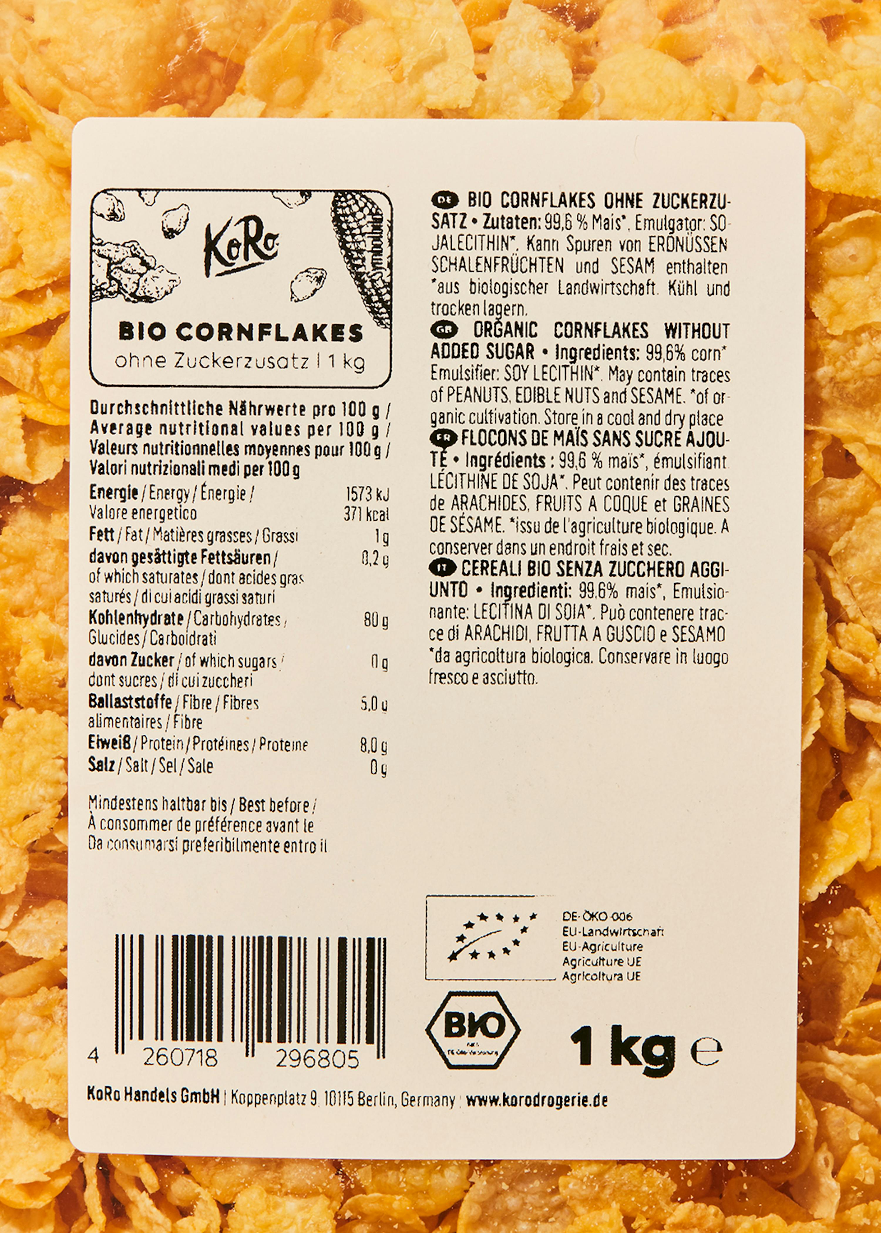 | Verkehrsbezeichnung | Bio Cornflakes ohne Zuckerzusatz |