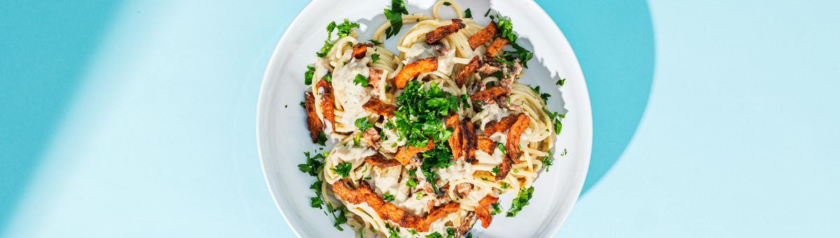 Serve the pasta on plates and top with the remaining vegan Mühlen Bacon Bites, pepper and fresh parsley.