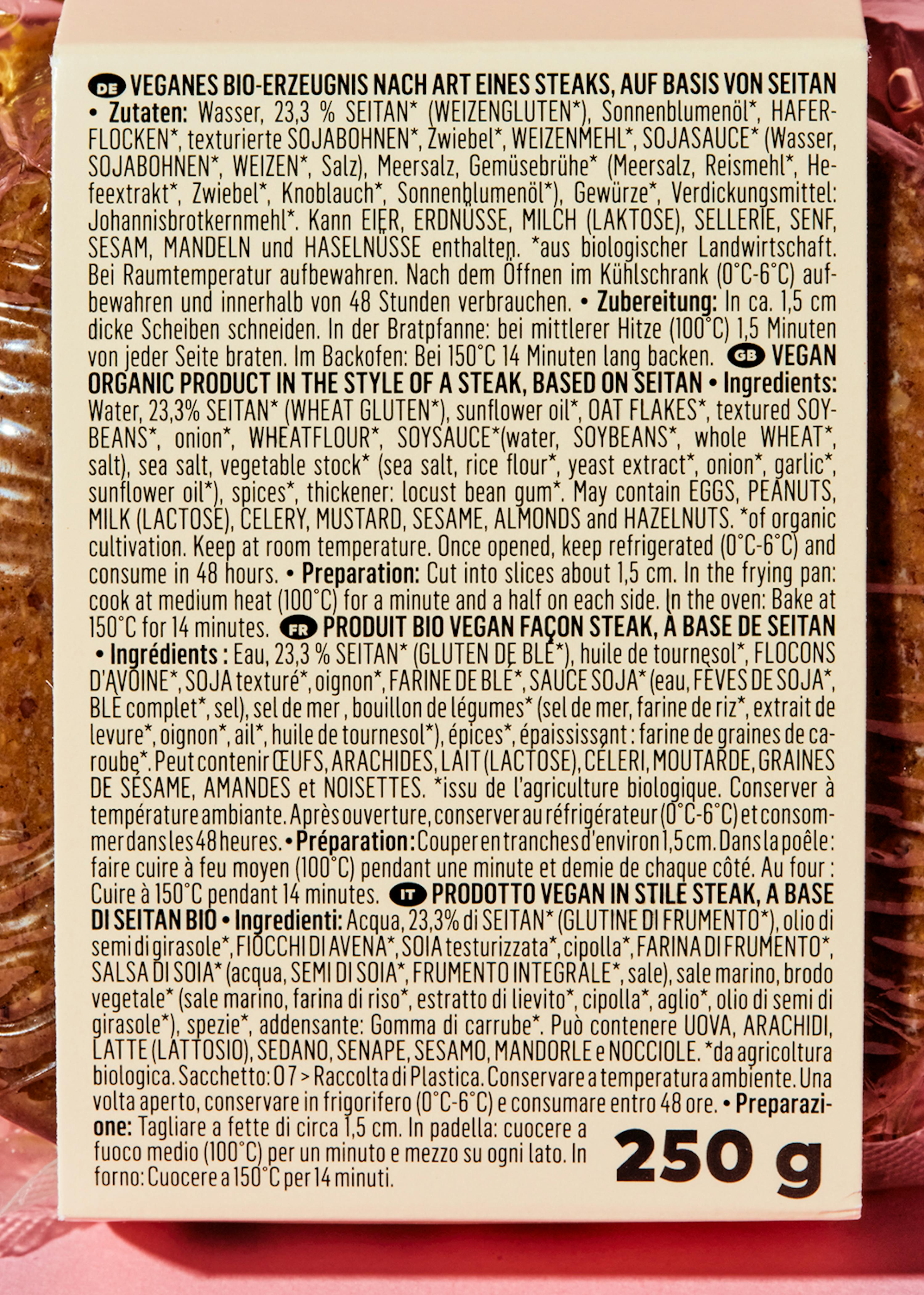 | Ingredients | Water, 23.3% SEITAN* (WHEAT GLUTEN*), sunflower oil*, OATS*, textured SOYBEANS*, onion*, WHEAT FLOUR*, SOY SAUCE* (water, SOYBEANS*, WHEAT*, salt), sea salt, vegetable broth* (sea salt, Rice flour*, yeast extract*, onion*, garlic*, sunflower oil*), spices*, thickener: locust bean gum* *from organic farming |
