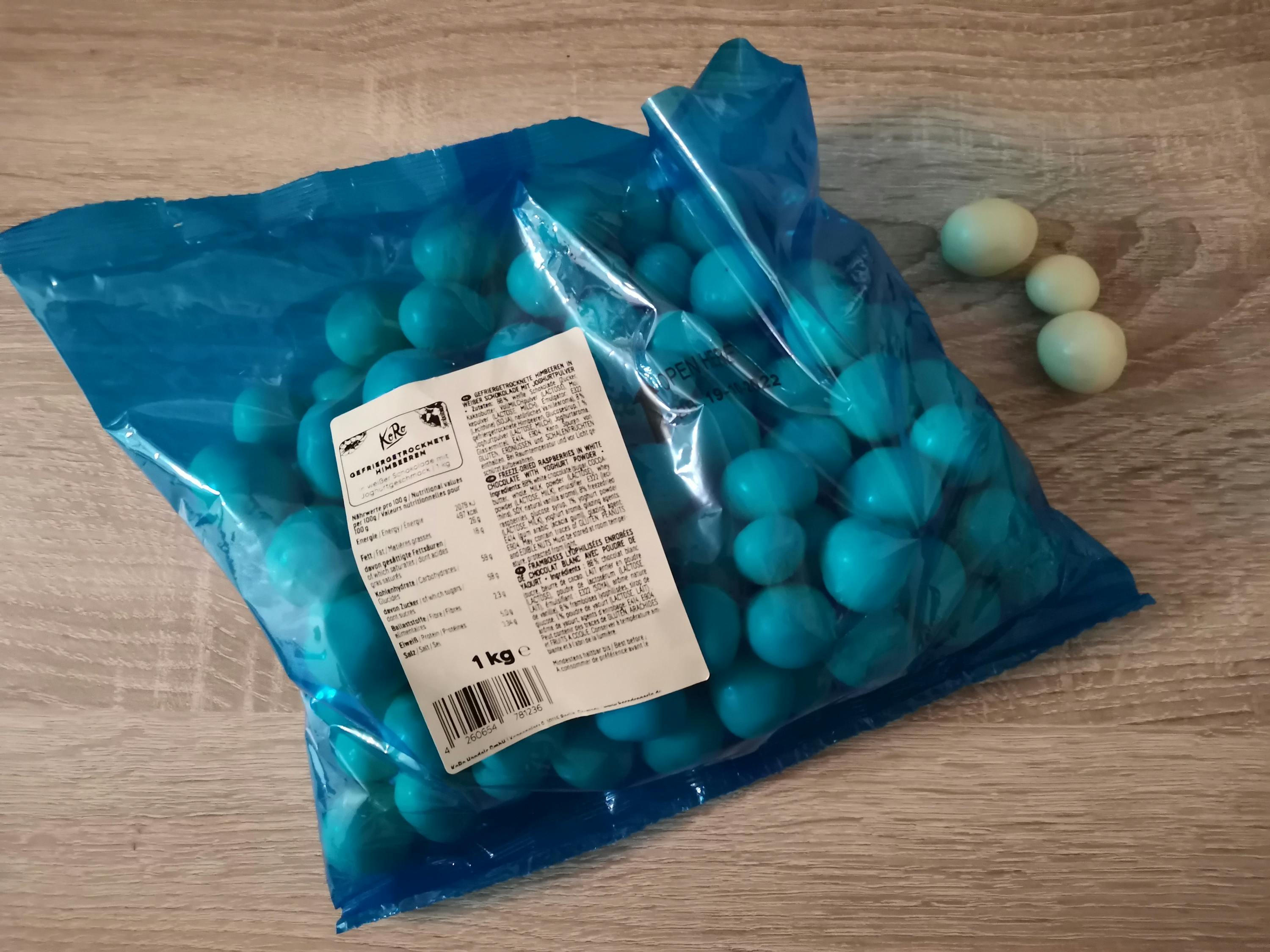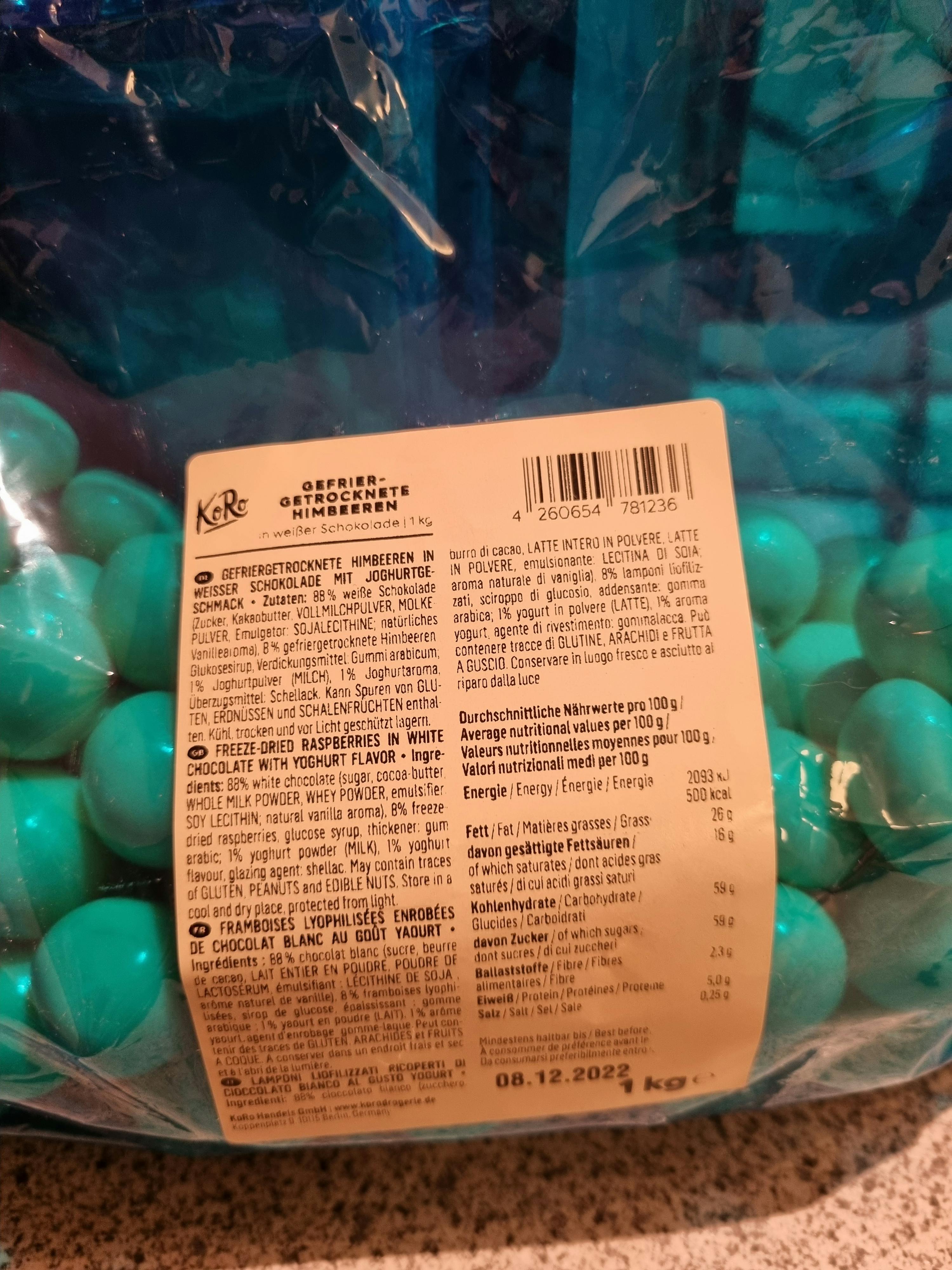 | Verkehrsbezeichnung | Gefriergetrocknete Himbeeren in weisser Schokolade mit Jogurtgeschmack |