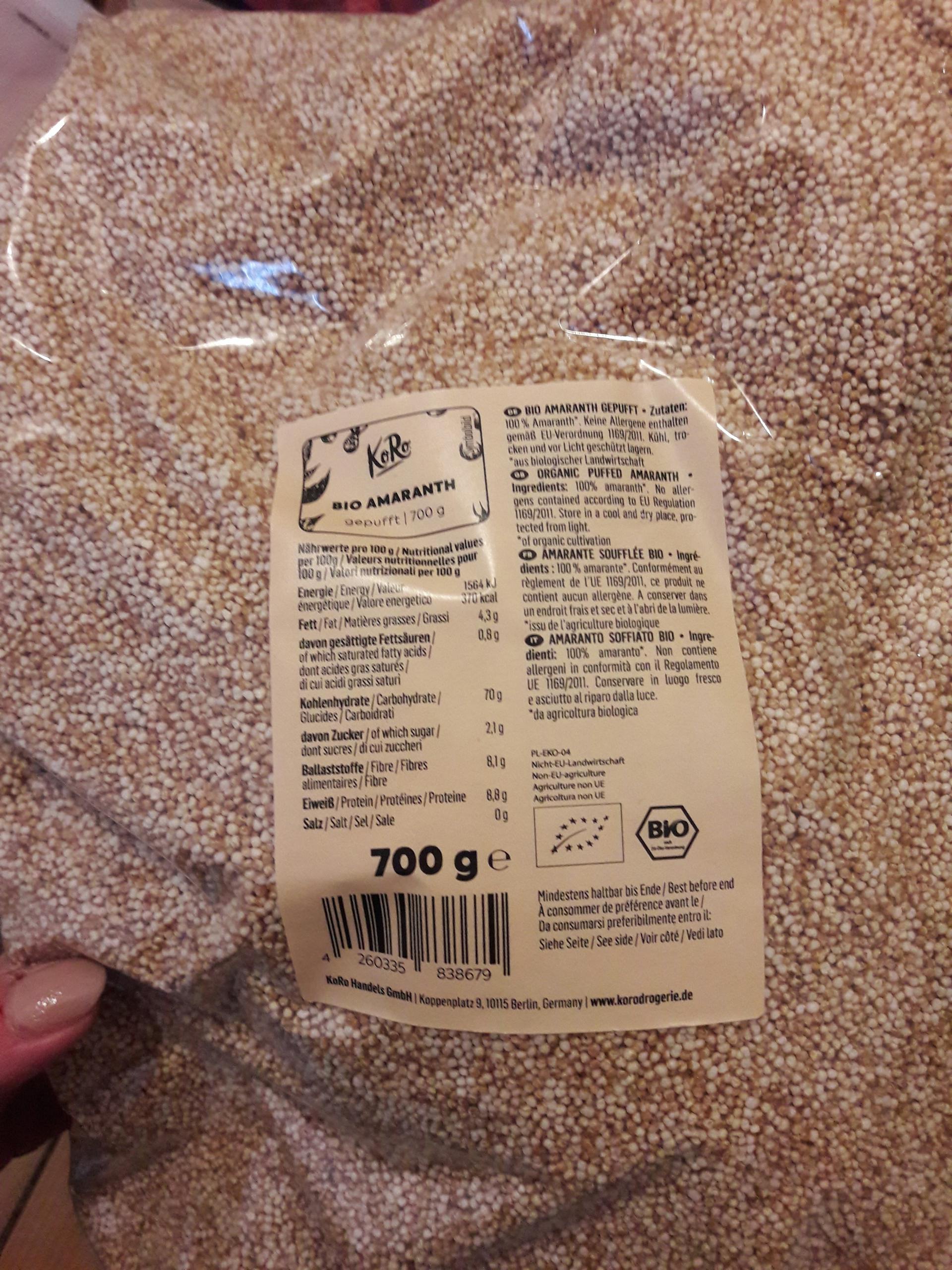 | Verkehrsbezeichnung | Bio Amaranth gepufft |