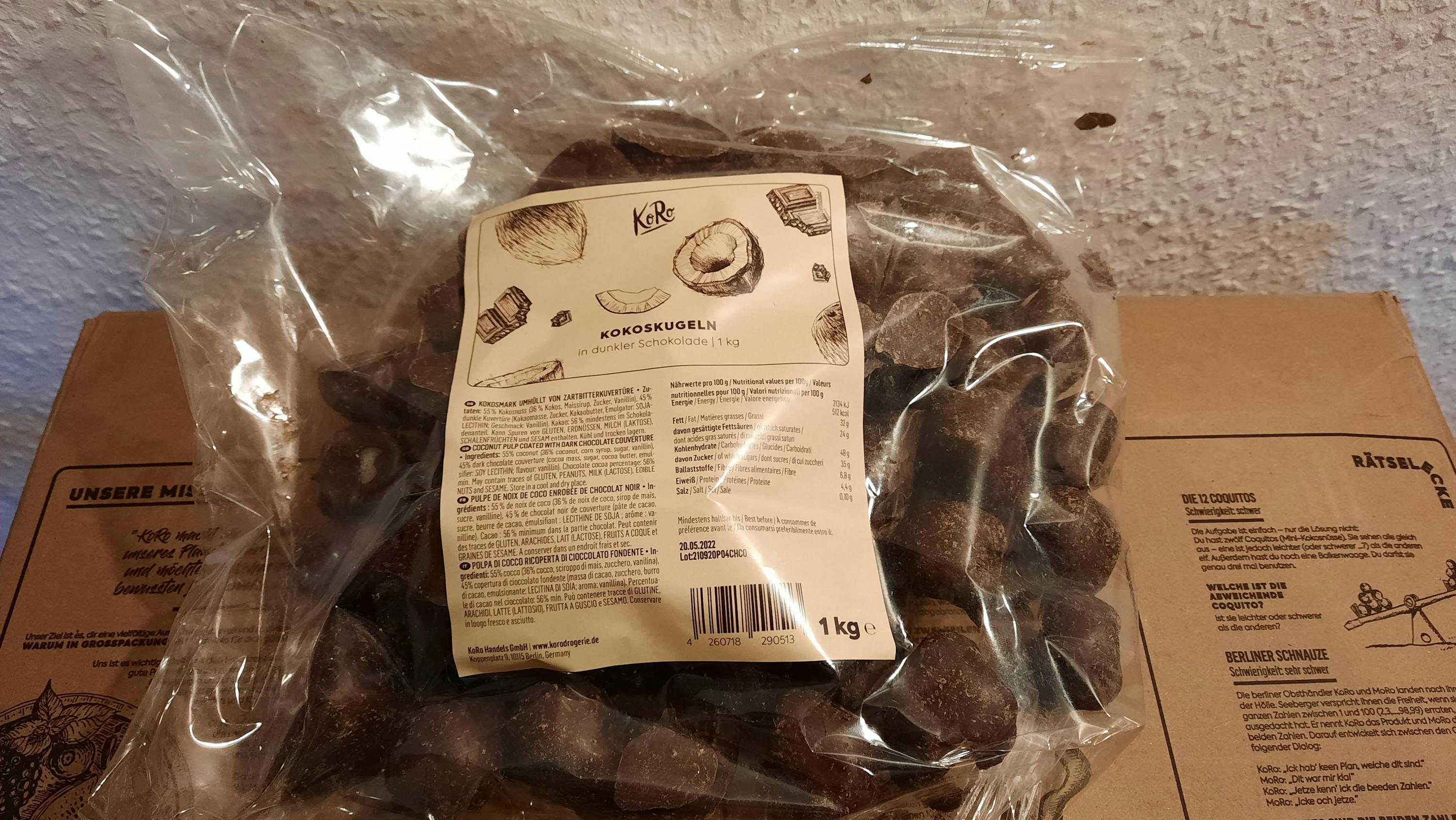 Wir lieben doch alle unseren Schoko-Kokosnuss-Riegel. Das Problem: Mit einem Riegel ist das süße Schlemmen immer zu schnell vorbei. Wir bei KoRo mögen unser Snack-Erlebnis lang und intensiv. Deshalb haben wir unsere Lieblinge dunkle Schokolade und fruchtige Kokosnuss in die perfekte Snackform gebracht und davon gleich 1 ganzes Kilo. Wir sind wahnsinnig? Vielleicht, aber auf eine gute Weise! So ist es Dir überlassen, ob Du nur eine Kokos-Schoko-Kugel naschst oder Dir so viele gönnst bist Du platzt.