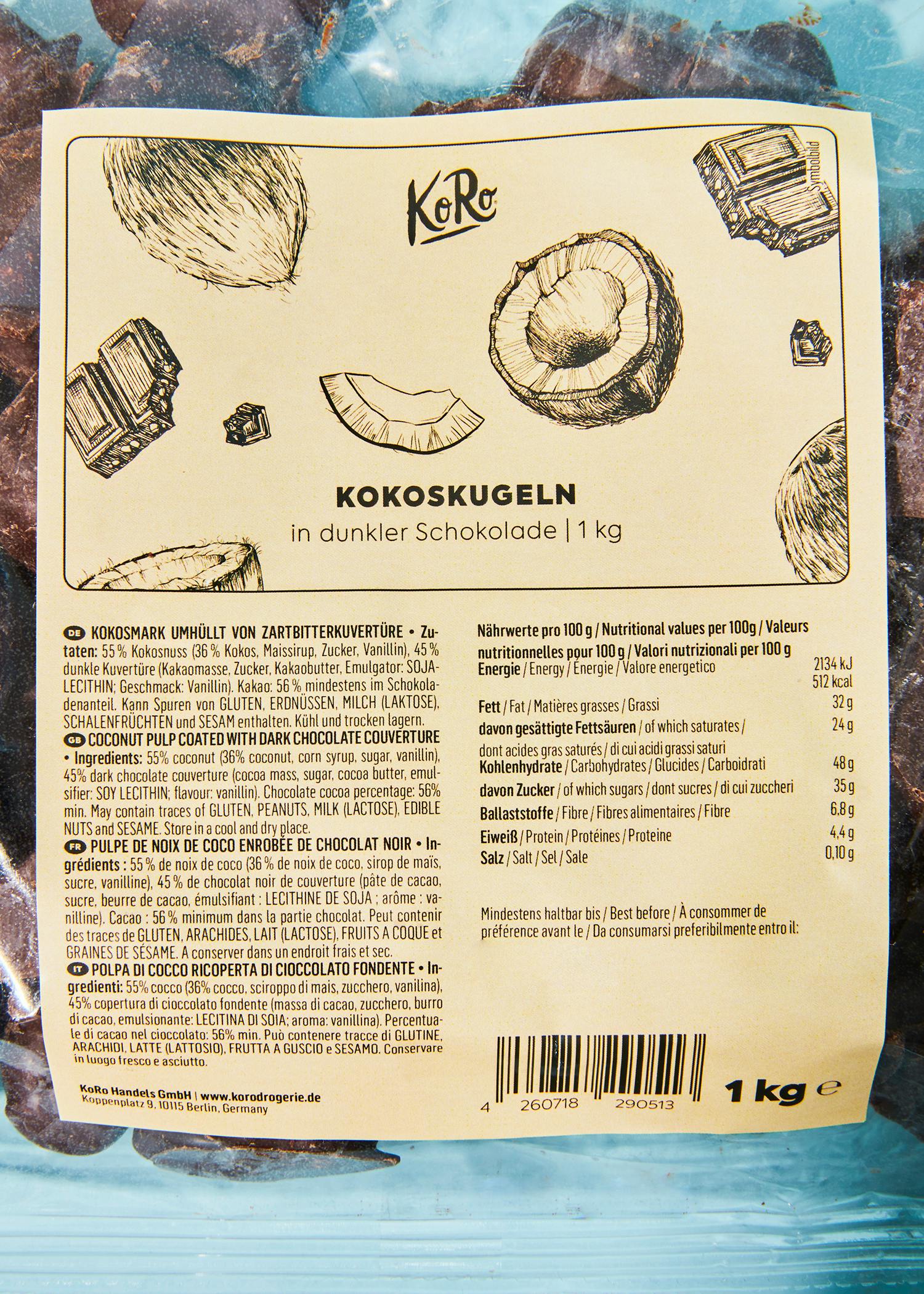 | Verkehrsbezeichnung | Kokosmark umhüllt von Zartbitterkuvertüre |