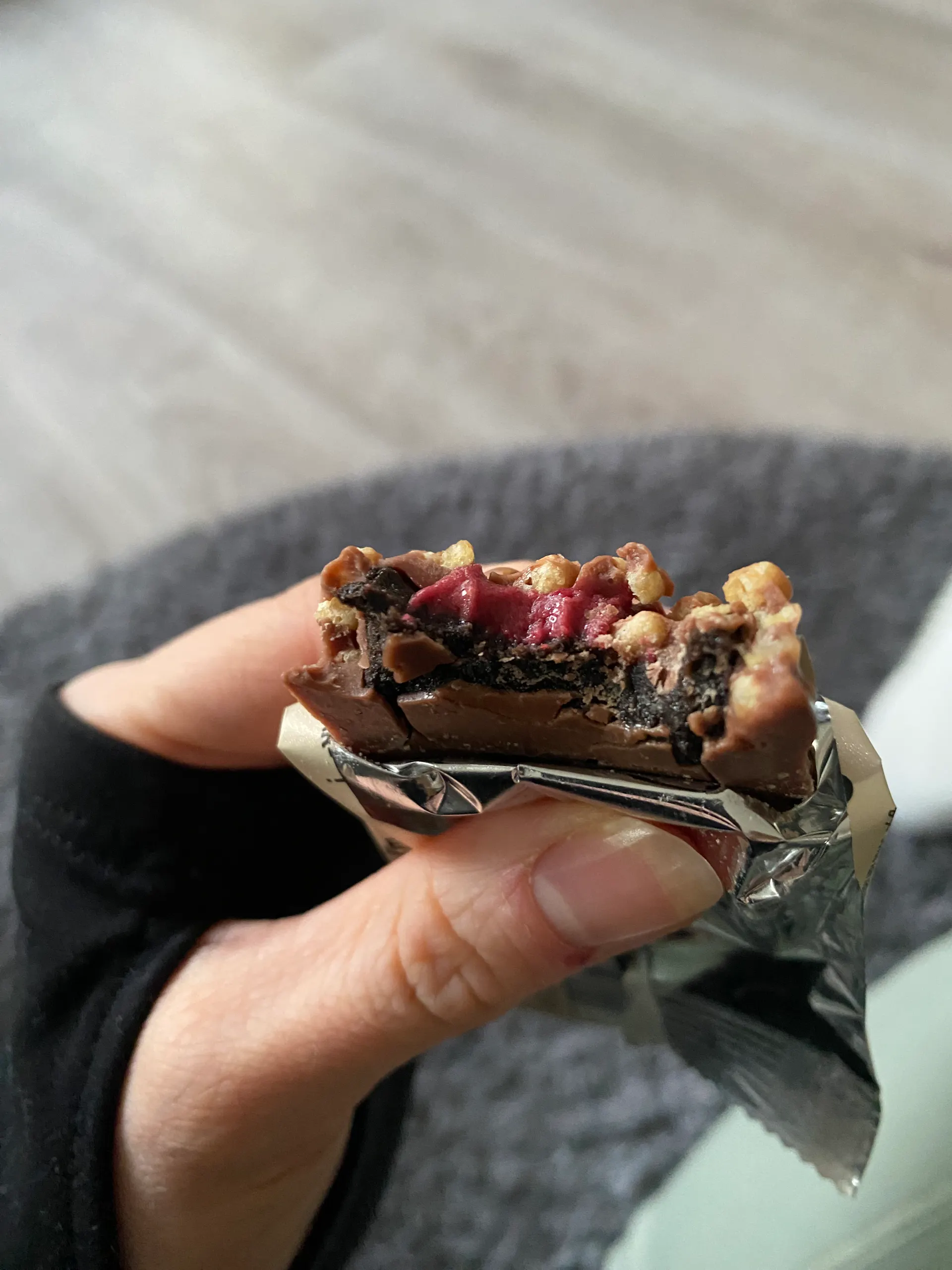 | Zutaten | Süßungsmittel: Maltit, Sucralose; 28 % Kakaobutterglasur mit Süßungsmittel (Süßungsmittel: Maltit; Kakaobutter, Reisextraktpulver, Kakaomasse, Kokosnussmilchpulver, Inulin, Emulgator: Lecithine, Salz), Erbsenprotein, SOJAPROTEIN, Feuchthaltemittel: Glycerin; 3 % Himbeerpulver gefriergetrocknet, Ackerbohnenprotein, Kakaobutter, Johannisbrotkeimmehl, fettarmes Kakaopulver, Reisprotein, Emulgator: Lecithine; natürliches Aroma, Salz, Säuerungsmittel: Citronensäure |